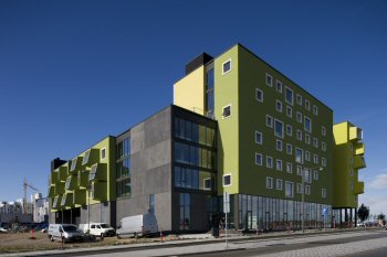 Der er over hundrede af dem hele vejen rundt om de syv etager, og det enkle men effektive altan-greb gør op med, at friske farver og finurlige former skulle være forbeholdt børneinstitutioner eller kulturbyggerier. Her kan også byens ældste bo i praktisk, men legesyg arkitektur.