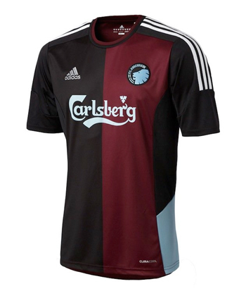 Karl-Oscar Olsen, der selv er FCK-fan, har da også skabt klubbens første todelte spilletrøje. Fronten er splittet i sort og bordeaux, og har lidt lyseblå detaljer på hofterne. Samt selvfølgelig de uundgåelige tre Adidas-striber på skuldrene.