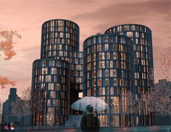 Bygges som fem sammenkoblede tårnbygninger i syv til 16 etager over jorden og fem etager under jorden.