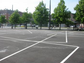 Overlappende kulturfelter udlånes Pladsen er blevet peppet op med et friskt lag sort asfalt og dekoreret med et hvidt, vejstribelignende mønster. Ved første øjekast ser det ud til at en opstribningsmaskine er gået grassat på pladsen, men ved nærmere eftersyn giver de irregulære striber mere mening.