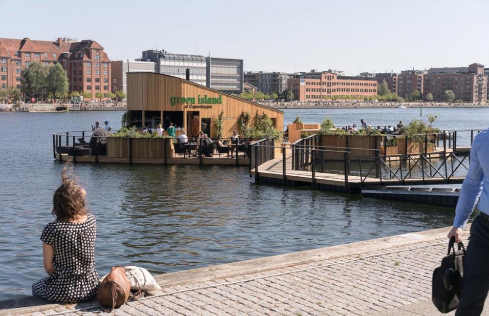 Green Island of Copenhagen hedder den nye flydende café på en midlertidig ø bygget i træ ud for den evigt udskældte strækning af triste kontorbygninger langs Kalvebod Brygge.