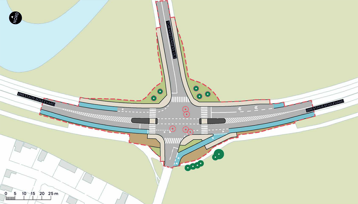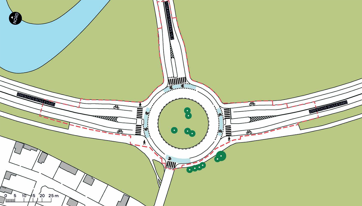 Den tidligere grønne plet i midten af rundkørslen forsvinder naturligvis, men til gengæld ankommer et par nye træer og lidt botanik i hjørnerne af det nye kryds.